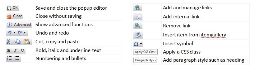 The popup editor has several functions and formatting options. The most common functions are shown in the basic view, but if the button “Advanced” is pressed you will see more detailed and advanced functions such as tables and indenting. Following are the functions that are most important to know: