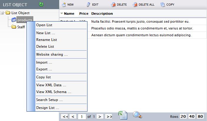 The lists can be found under “Modules” and then “List Object” in the navigation bar. The List object displays a certain number of instances from a list in a similar way that the Newslist control shows a certain number of news items in a list format. The instances in the list can be in various forms, types and sizes, from a number to an image or file. The list object can be used in a similar way as a database, storage for data, and the ways you can show the data and how the data is collected online can be custom made with an XSLT file.