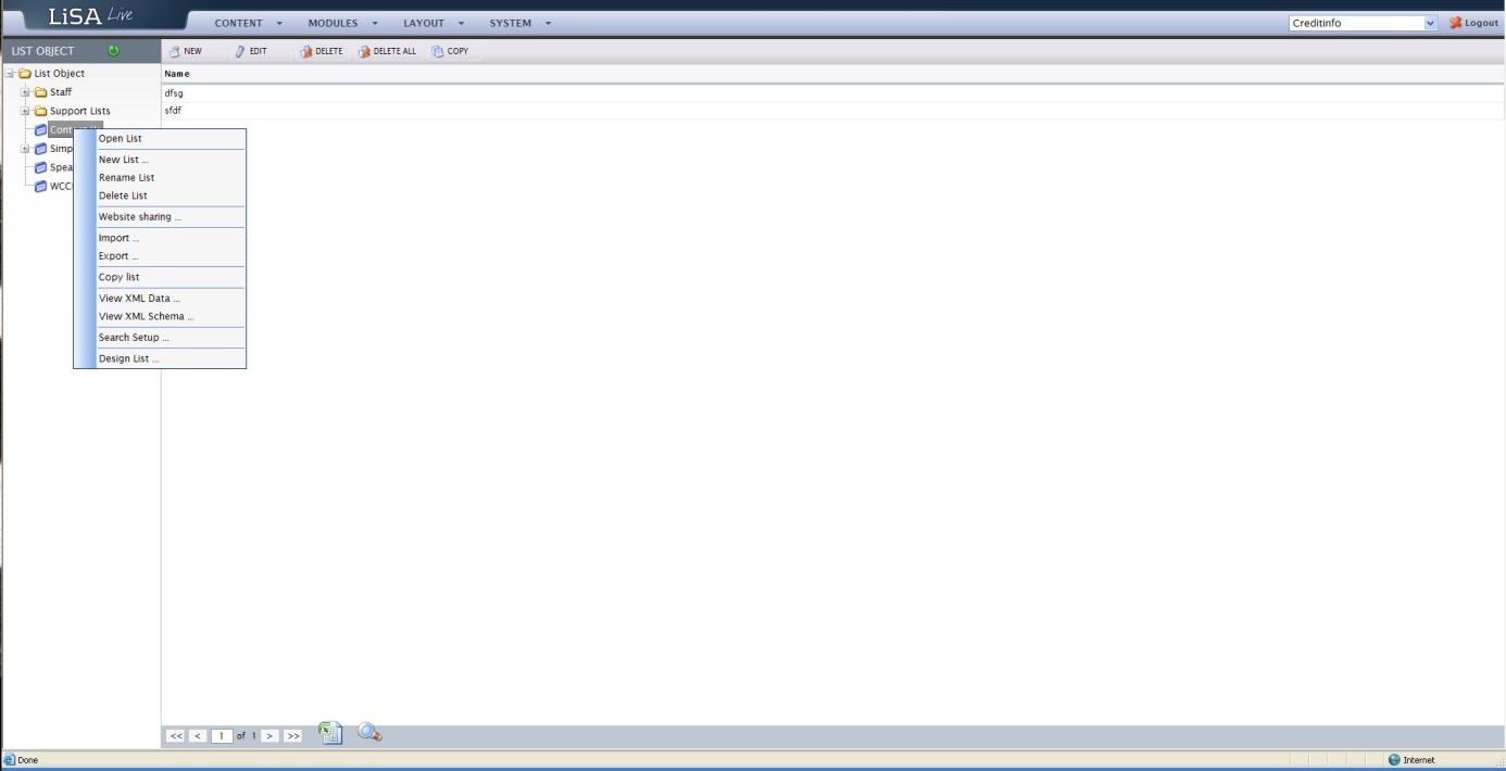 When designing a new list object right click on the folder list Object and choose “New list” or “New folder”. Once the list has been created right click on the list itself and choose from the menu: