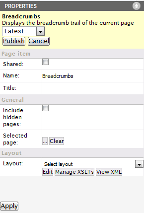 - Include hidden pages: Specifies if pages that are hidden should be displayed in the breadcrumb trail.