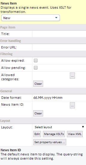 - Allowed categories: Specifies from which news categories this control is allowed to display items. If no categories are specified, all categories are allowed.
