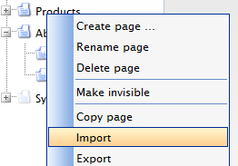 - Right click the page name you want the new page to be subpage off and press “Import”.
