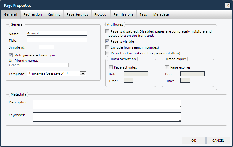 The “General” tab is divided in to three different sections: General, Attributes and Meta data. In the first section, General, there are three options regarding the name and URL of the page: