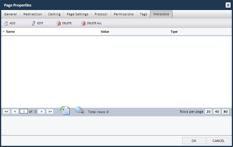 The Metadata tab allows the user to enter custom metadata for the page. Clicking "Add" brings up a pop-up menu where the User can select the type of metadata to be added from a drop down menu, and then specify the content for that tag. For example, the user may wish to add Facebook Open-Graph tags to the page, specifying which image or description to be included in Facebook activities such as "liking" and "sharing".