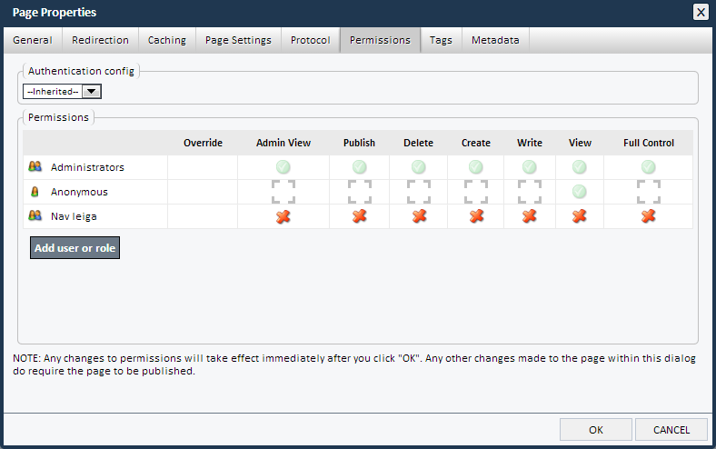The override column in the permissions table is worth mentioning. If a user is a member of more than one usergroup, LiSA will use the usergroup with the lowest level of permission to define whether the user is permitted to perform a given action on the page. Take the example of a user called Bob, Bob is a member of the usergroup Administrator and also a member of the usergroup Nav leiga. As can be seen, the Administrator group has full control whereas the Nav leiga group has no privileges . In normal circumstances LiSA will prevent Bob from making any changes to the page, because although he is a member of the Administrator group who are permitted full control, he is also a member of the Nav leiga group who have no permissions for the page. In this instance Bob will not be able to edit the page, as LiSA will use use the usergroup with the lowest level of permission (Nav leiga). To permit Bob full access, there are two options. Firstly we could select the "Override" column on the Administrator row, this would have the affect of permitting all Administrators full control regardless of which other usergroups they are members of. Alternatively we could click the "Add user or role" button and select Bob individually as a user, add him to the Permissions table, set the desired level of control, and then click the Override column on Bob's row. This would have the effect of allowing just Bob full-control (other Administrators would still be prevented from making changes if they belonged to other user groups who are not permitted to edit the page).